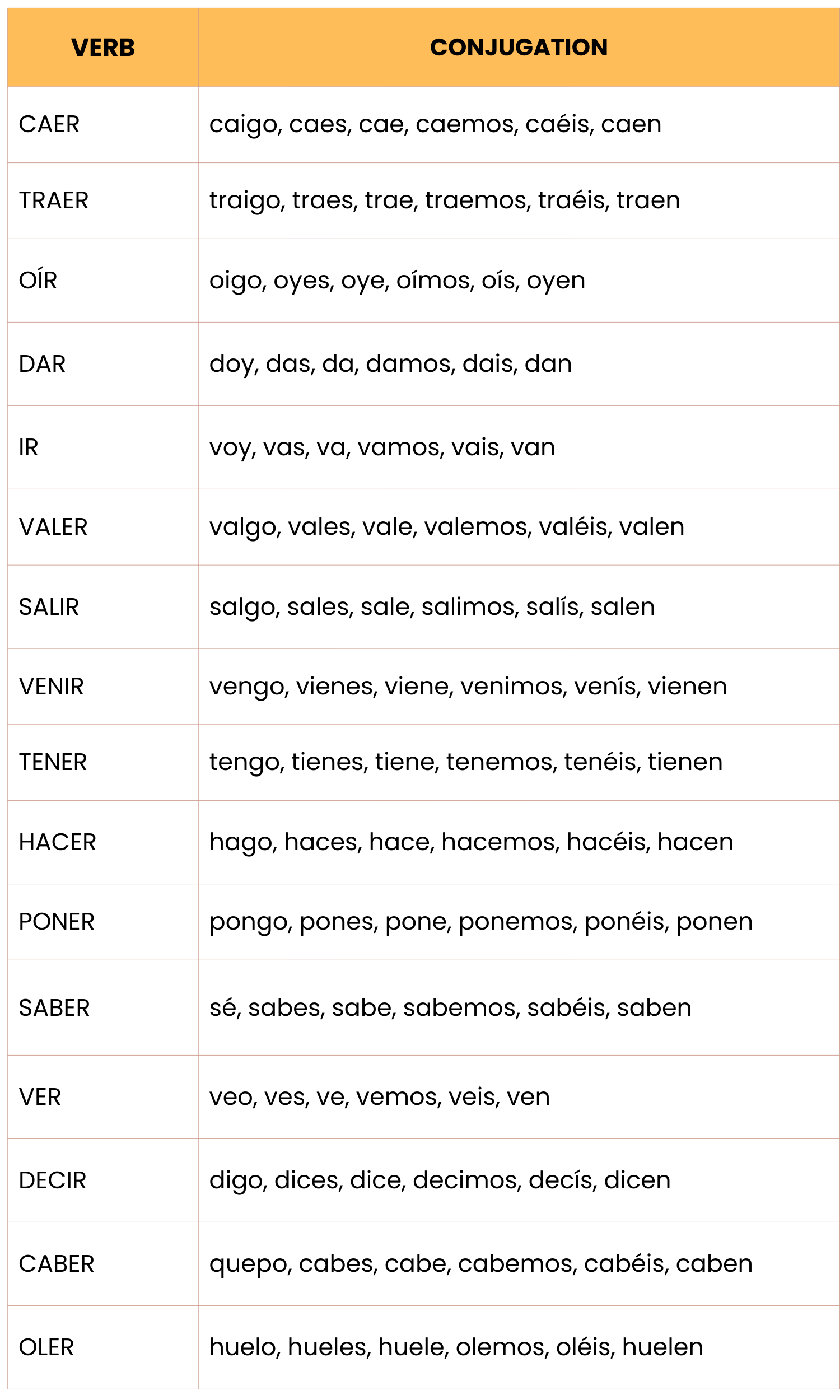 As you can see, the chart shows the verbs that share some similarities in their patterns, and this is exactly what helps us memorize them faster. If we forget one of them, we can always recall a similar one. Also, you don’t need to memorize each of the conjugations because, as you can see in the chart not all the forms are irregular. In fact, the majority of them are just irregular in the “YO” form which makes the path easier too!
